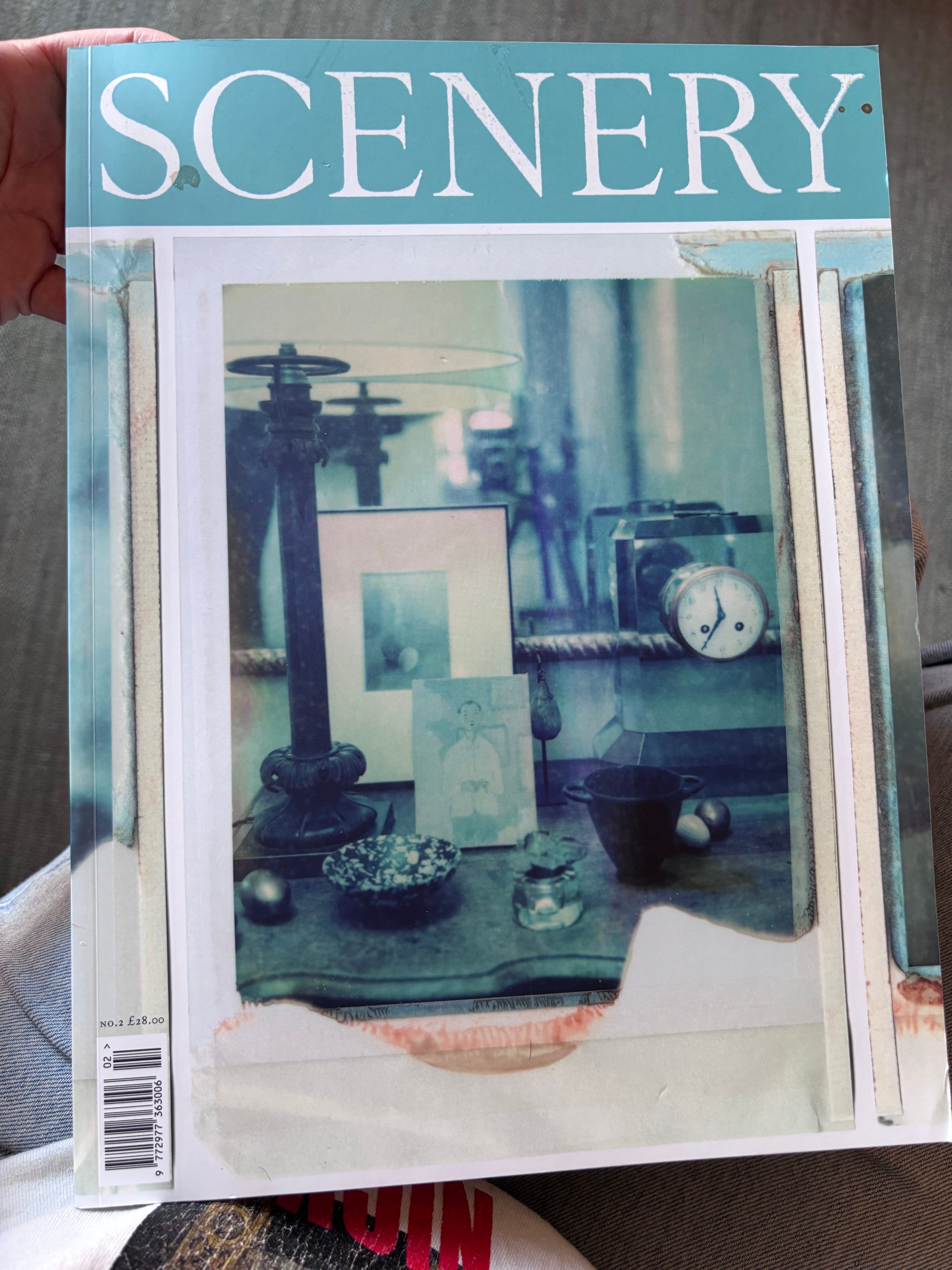 Next I turned to the new-ish Scenery, which is probably my favorite of the latest interior print periodicals. This is from the second issue (Number Two). This magazine is a visual feast - very photo heavy, it has a great mix of historical interiors, contemporary eccentricity, interesting artists and makers, and detail shots to beat the band. It feels related to The World of Interiors in its celebration of the un-polished, which is so needed. I found more lacy sheer inspiration within.