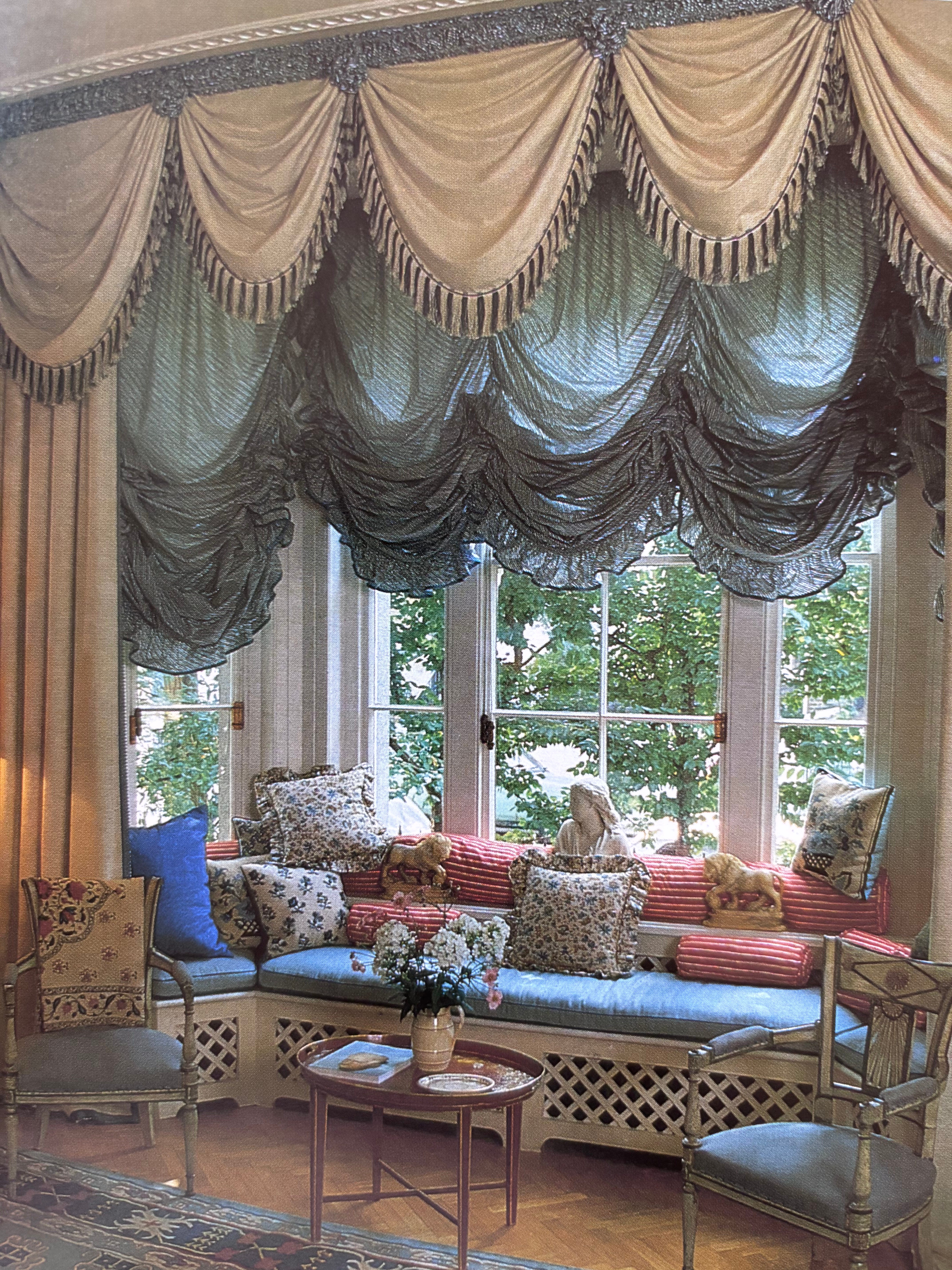 To be honest, I didn’t expect to find my precedent image here. I expected the window treatments within to recede, and many do. But when I landed on Irving Harper’s Rye, New York home, I was struck. (Wright had an exhibit of Harper’s paper sculptures in 2016. I have the catalog from that show, and while there are no window treatments, Harper’s work is mind boggling and delightful.)