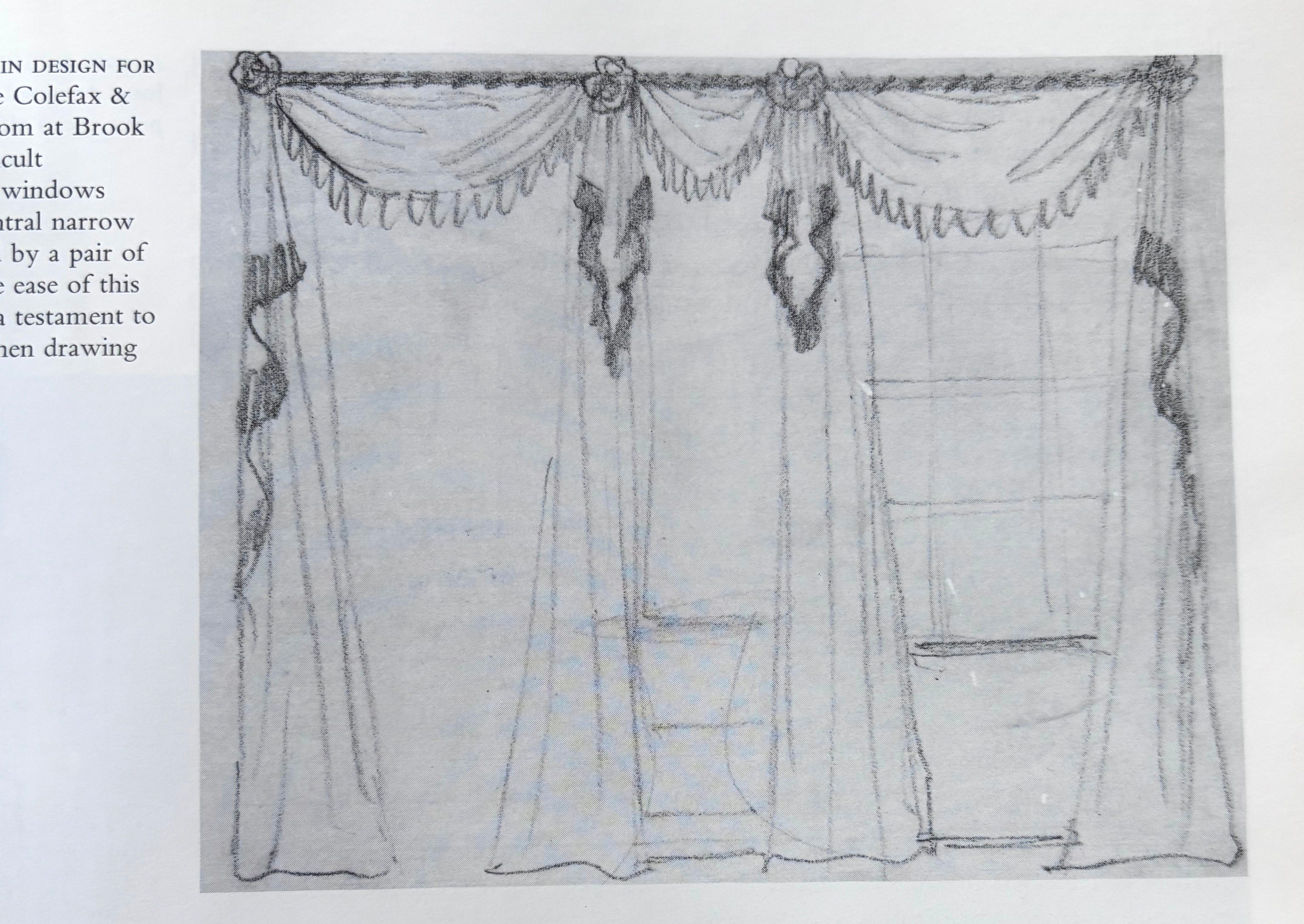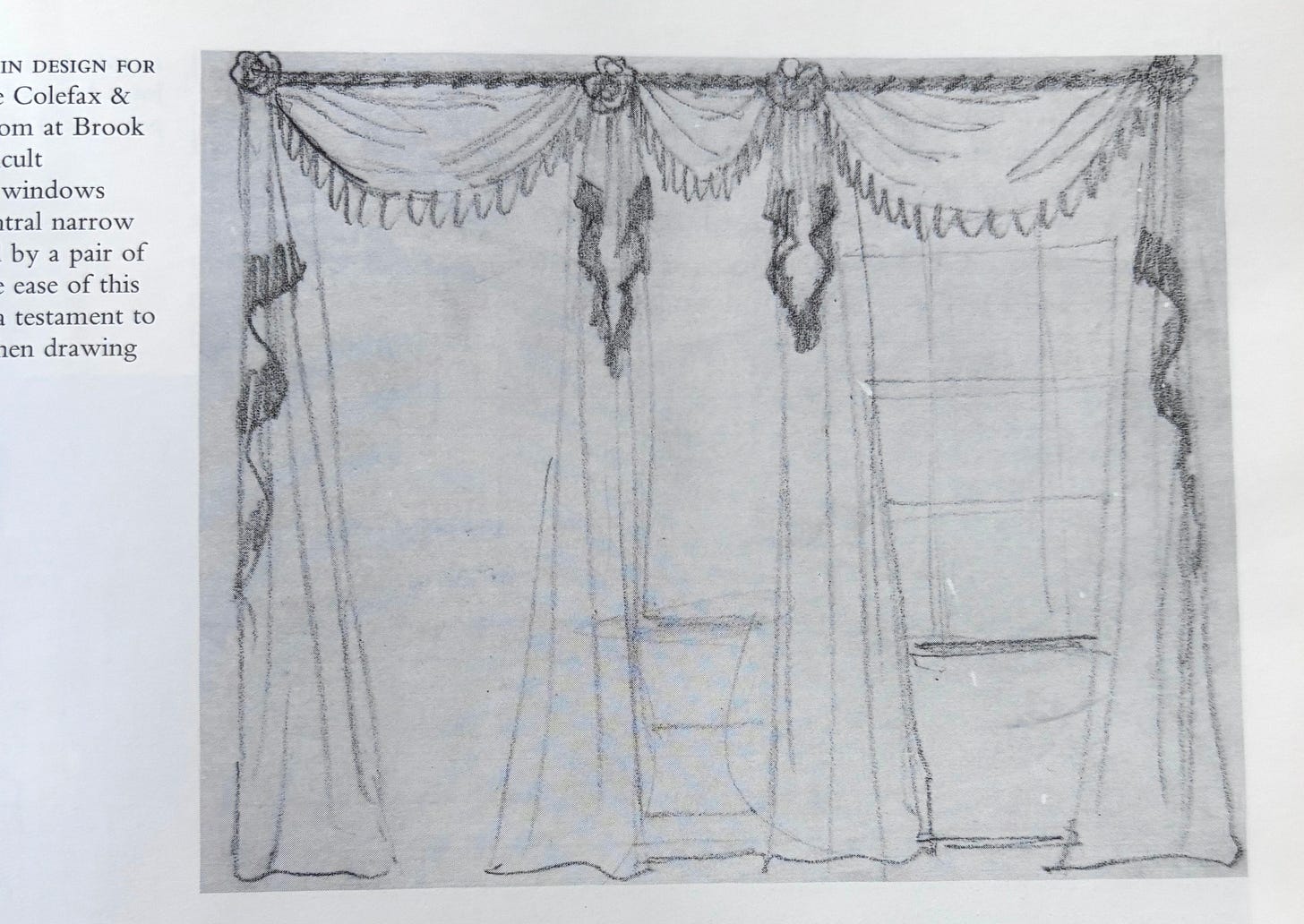 As I said, I love trad, so I came first to the vaunted British interior designers Sibyl Colefax and John Fowler who basically invented English country style. (Buy the book here.) Prints on prints on chintz etc. and some seriously fanciful curtains. I know this is likely not where I will find my personal precedent but I like to start at the beginning, and it is great inspiration for fabrics. The book is filled with lovely hand-drawn details done by Fowler: